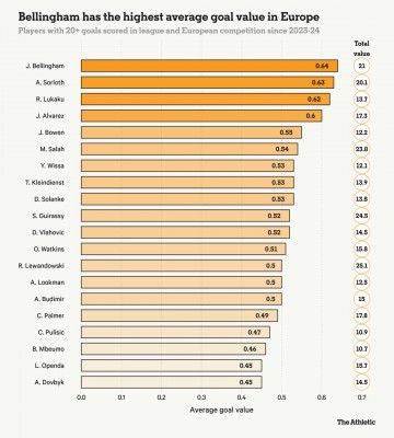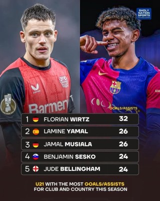Если пересчитать голы и ассисты за 90 сыгранных минут в среднем, без учета пенальти (так как у Виртца на почти 400 минут больше игрового времени по сезону), то у них почти идентичные показатели: 0,85 у Фло и 0,78 у Джамала