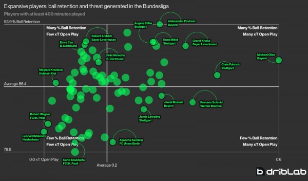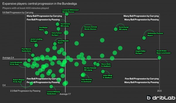 Мусиала и не должен заниматься продвижением мяча, это задача центральных полузащитников. Так как Павлович получил травму, а Киммиха активно прикрывают, поэтому Мусиале приходится продвигать мяч со своей половины в том числе и за счет дриблинга.