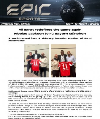 Ali Barat's agency 'Epic Sports', representing Nicolas Jackson, released a statement with the details of Jackson's move to Bayern, including a 'world record loan fee', a 'mandatory buy option' and a future sale percentage for Chelsea.