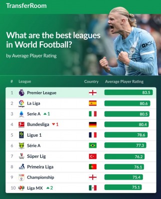 Ресурс TransferRoom обновил список 20 лучших футбольных лиг мира по среднему показателю рейтинга игроков. При расчетах использовался уникальный рейтинг игроков TR Player Rating – сложный алгоритм, основанный на миллиардах точек данных, который постоянно совершенствуется с помощью ИИ. Рейтинг игрока учитывает качество команды, количество проведенных минут, уровень соперников и индивидуальные статистические показатели с учетом позиции