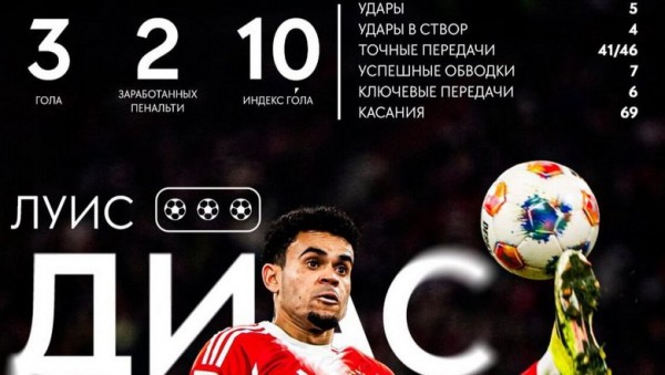 Диас – лучший игрок матча «Баварии» с «Хоффенхаймом» по версии ГОЛа. Луис Диас получил максимальную оценку по Индексу ГОЛа – первым в истории. Игра вингера «Баварии» в матче с «Хоффенхаймом» (5:1) в 21-м туре Бундеслиги была оценена на 10. Он забил три гола и заработал два пенальти.